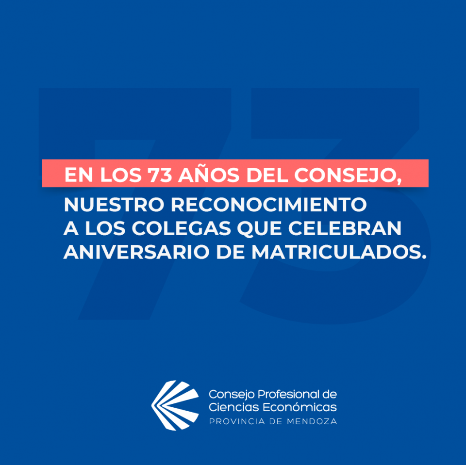 14/10/2020 - Este 14 de octubre, el Consejo cumple 73 años al servicio de los Contadores, Economistas y profesionales afines a las Ciencias Económicas de la provincia. Dentro del marco de los festejos, que este año se realizan de manera no presencial a lo largo de toda la semana, la institución otorga un especial reconocimiento a la trayectoria de aquellos Matriculados que cumplieron 30 y 50 años en el ejercicio de la profesión. También destaca el trabajo de los coordinadores y subcoordinadores de comisiones.